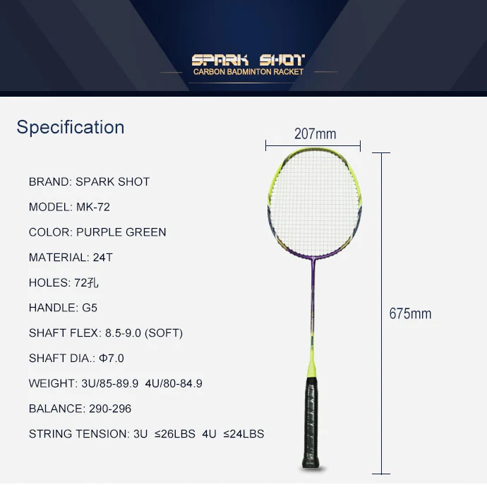 7,0 mm gredi ogljik badminton Racket MK72 izdelujejo s polnimi ogljikovimi materiali. S 7,0 mm premerom gredi. To je za profesionalnega igralca.